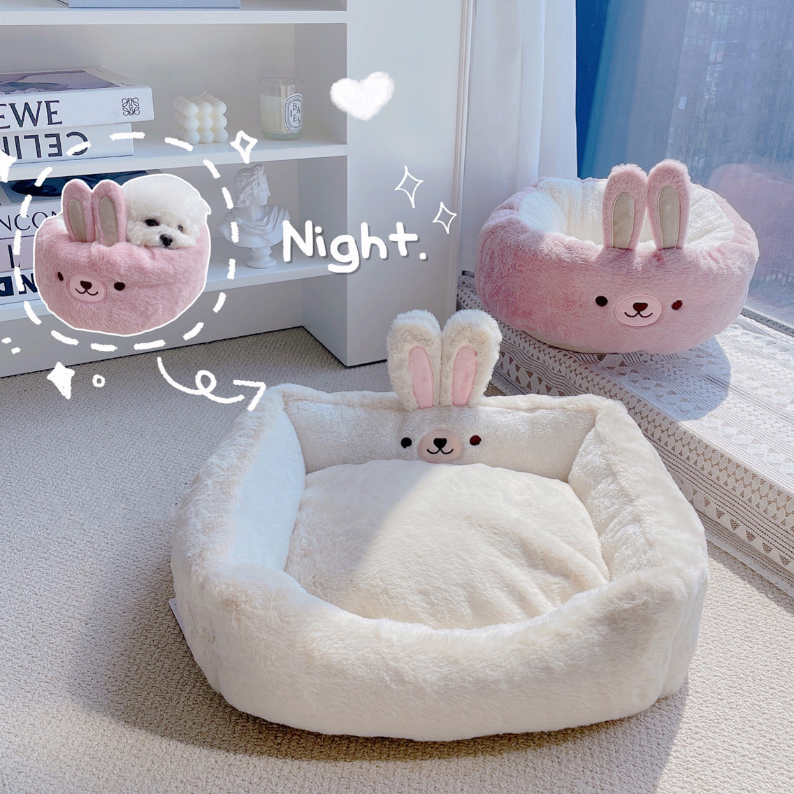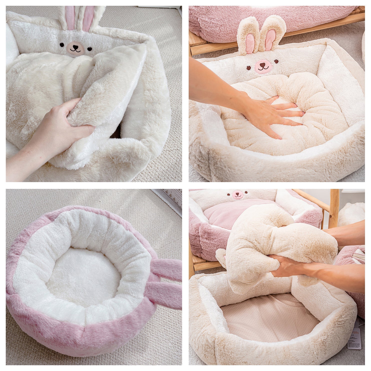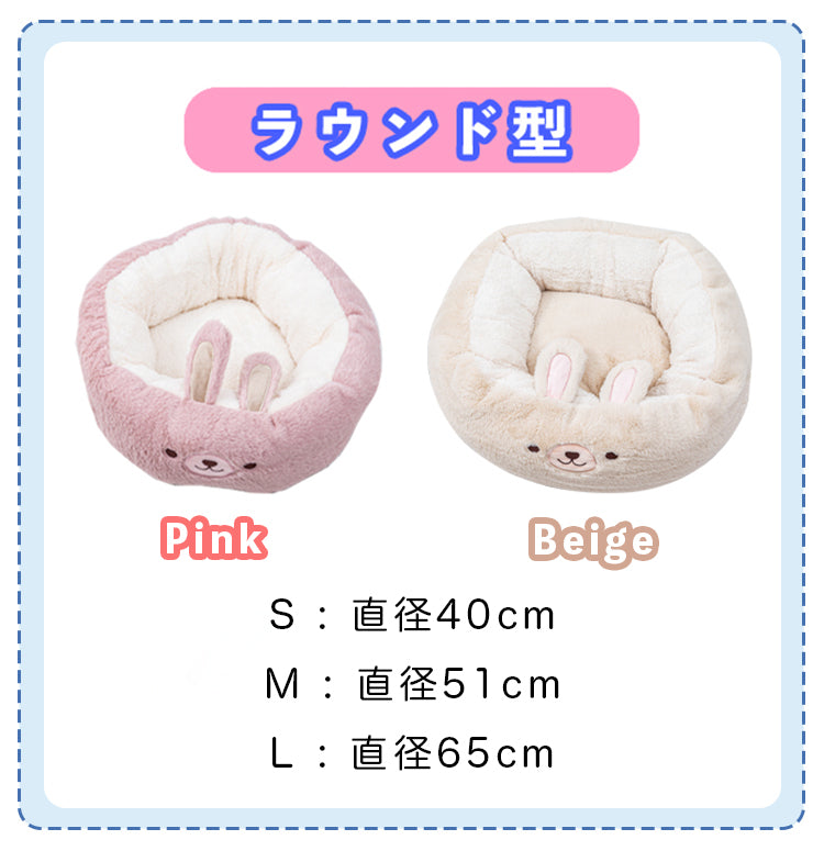 ベッド型とラウンド型でうさぎちゃんのお顔の向きが違うのがポイントですね!のんびりへそ天で寝たい子、小さくまるまって寝たい子…愛犬ちゃんのお好きなタイプをお選びください♪